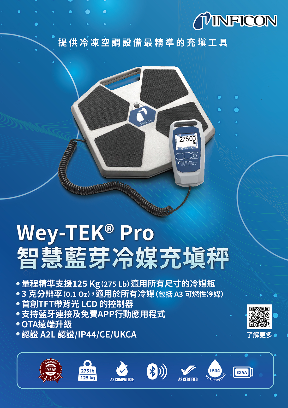■量程精準支援125 Kg(275 Lb)適用所有尺寸的冷媒瓶