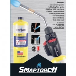 美國SMAPTORCH燒焊瓦斯組 (把手型簡配版) NO.STH-71BK ★全新配備掌上自動點火器及螺旋噴火頭特點! ★高效能火炬★輕便行動攜帶★燒焊角度不受限 產品特徵: 使用美國MAP//PRO黃色瓦斯燃點溫度可達1316℃。 內含美國MAP//PRO黃色瓦斯一罐。